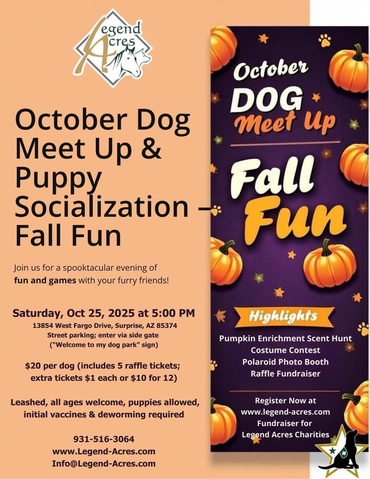 Join Legend Acres on Oct 25 in Surprise, AZ for the Pumpkin Pup Social 🎃 — a trainer-led dog event with scent hunts, costume contest & raffle fundraiser supporting veteran service-dog scholarships. 100% goes to the cause.