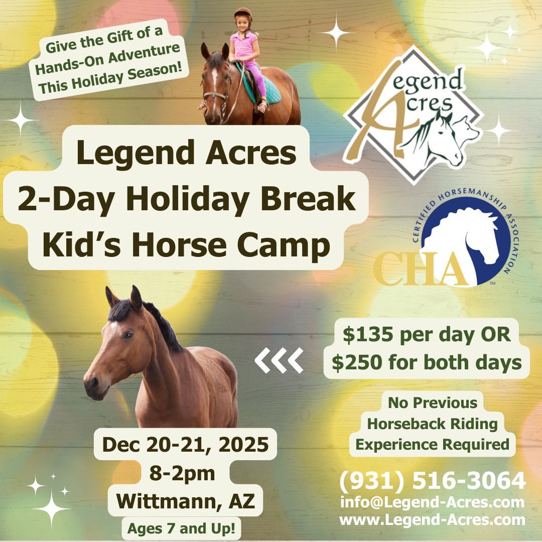 Celebrate the holiday season with a fun, educational, hands-on horse camp at Legend Acres in Wittmann, Arizona. Our Holiday Break Kids Horse Camp is designed for ages 7 and up and welcomes all skill levels, including first-time riders. Each camper is assigned their own horse for the day and learns real horsemanship through safe, guided activities led by certified instructors.