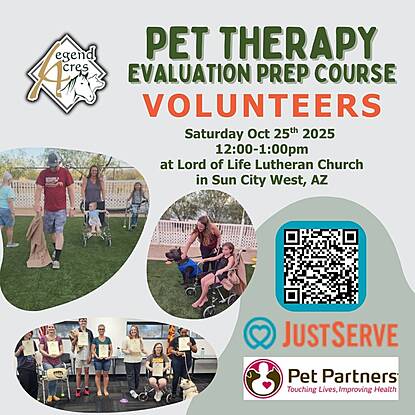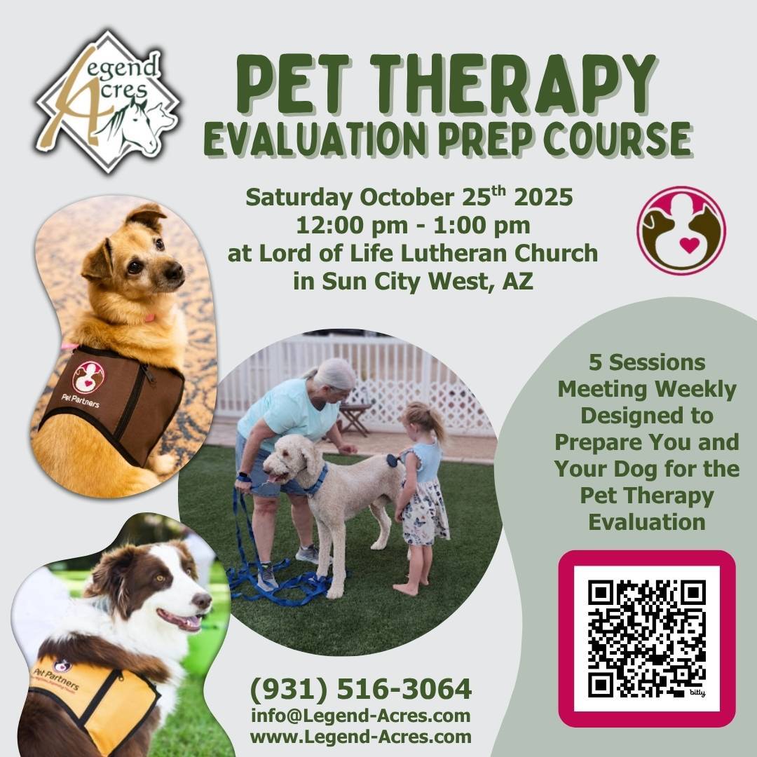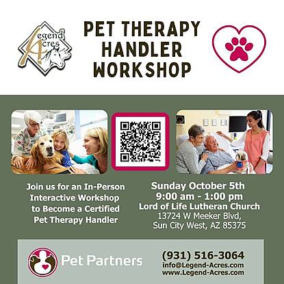 Legend Acres is proud to present our Pet Therapy Program, preparing dogs and handlers to become registered Pet Partners® therapy teams. Therapy animals bring comfort, connection, and joy to people in hospitals, schools, senior living, and community settings.