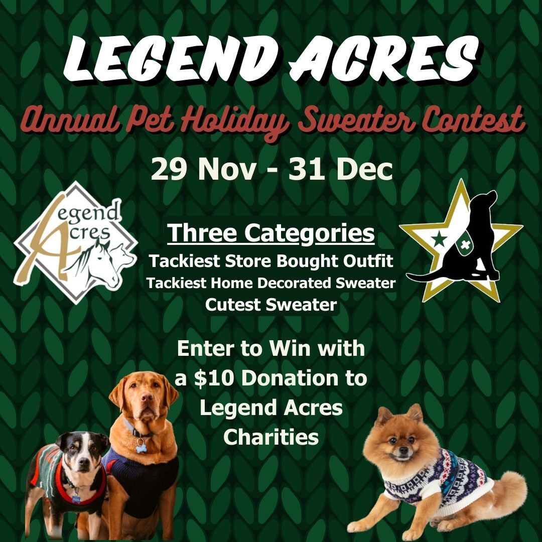 Join the Legend Acres Virtual Holiday Sweater Contest — a month-long fundraiser supporting the Legend Acres Charities Foundation, helping provide service dog training scholarships, equine-assisted wellness programs, and trauma-informed community support.